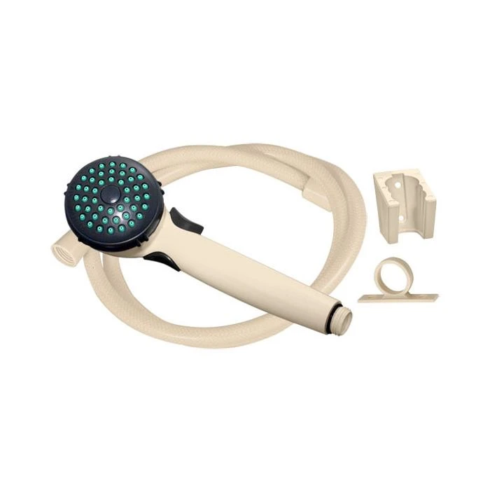 Single function spray head has a water saving trickle valve on the hand set. Kits include hose guide, 3 position shower bracket, and 60″ hose. Chrome kit includes a stainless steel hose.